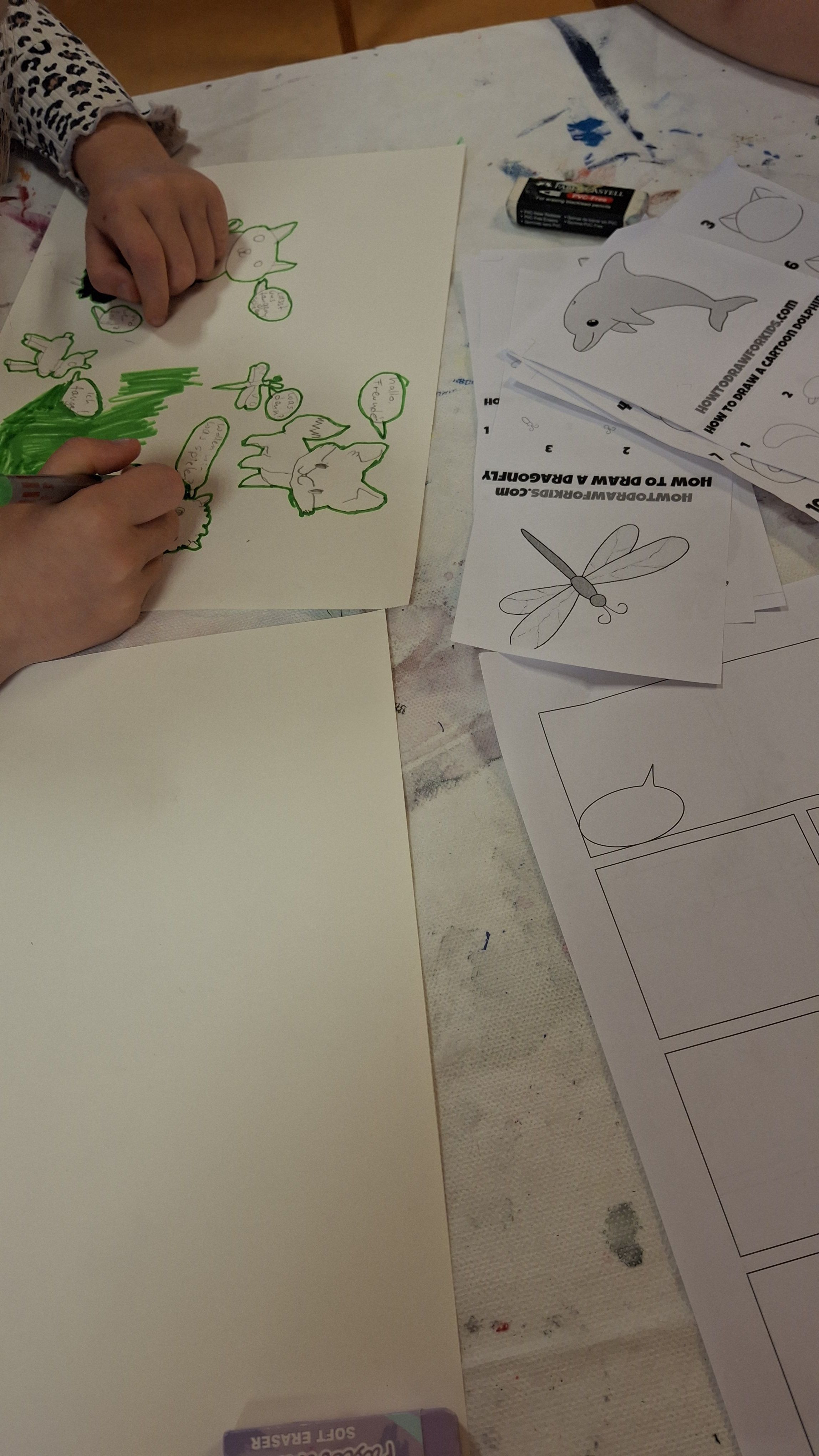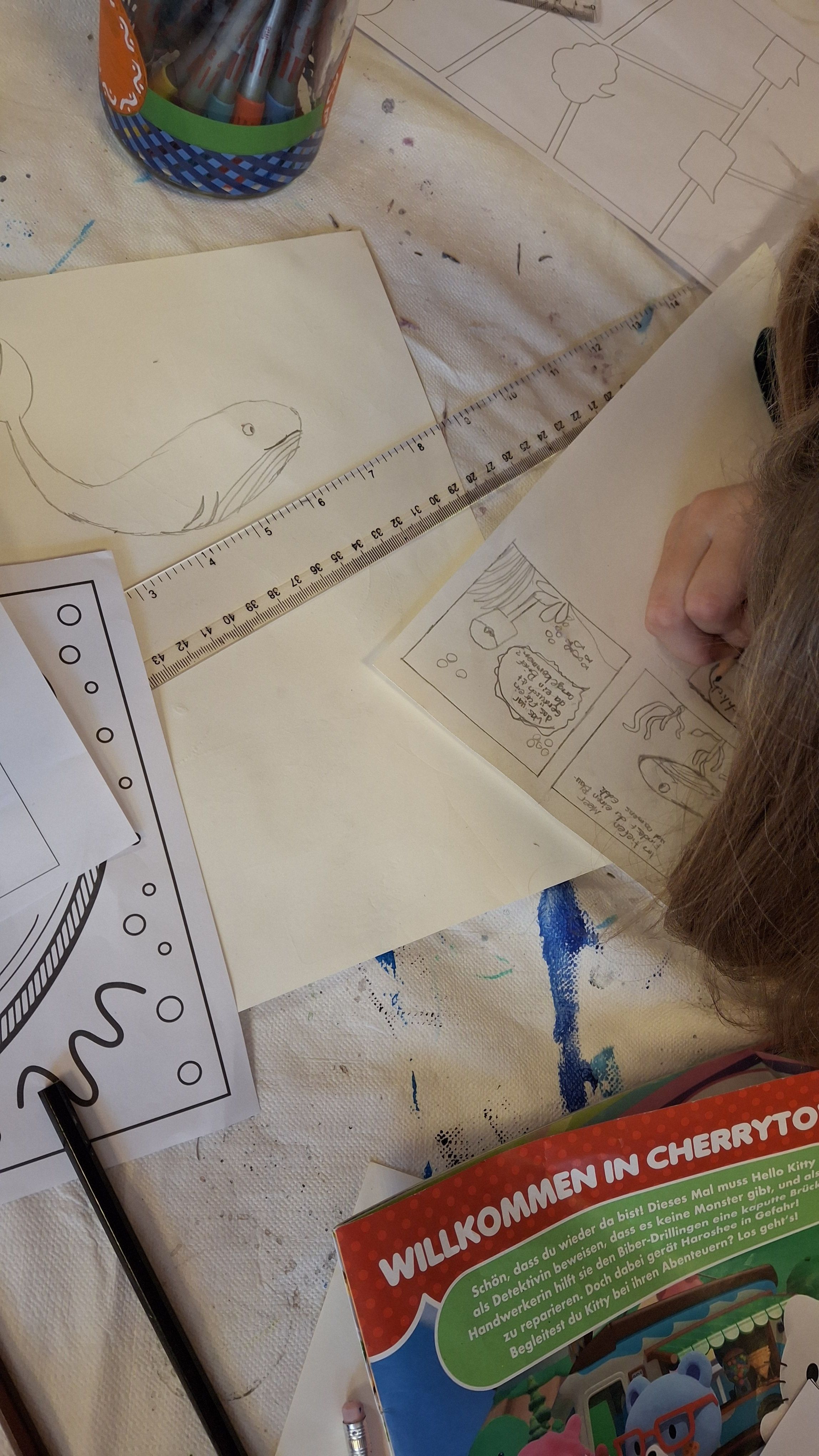 Das offene Atelier bietet Kindern eine wunderbare Gelegenheit, ihre eigenen kreativen Ideen unter fachkundiger Anleitung zu verwirklichen und gleichzeitig wichtige künstlerische Techniken und Grundlage zu erlernen. An diesem Tag wird mit Bleichstift und Farbstiften auf Skizzenpapier gearbeitet.