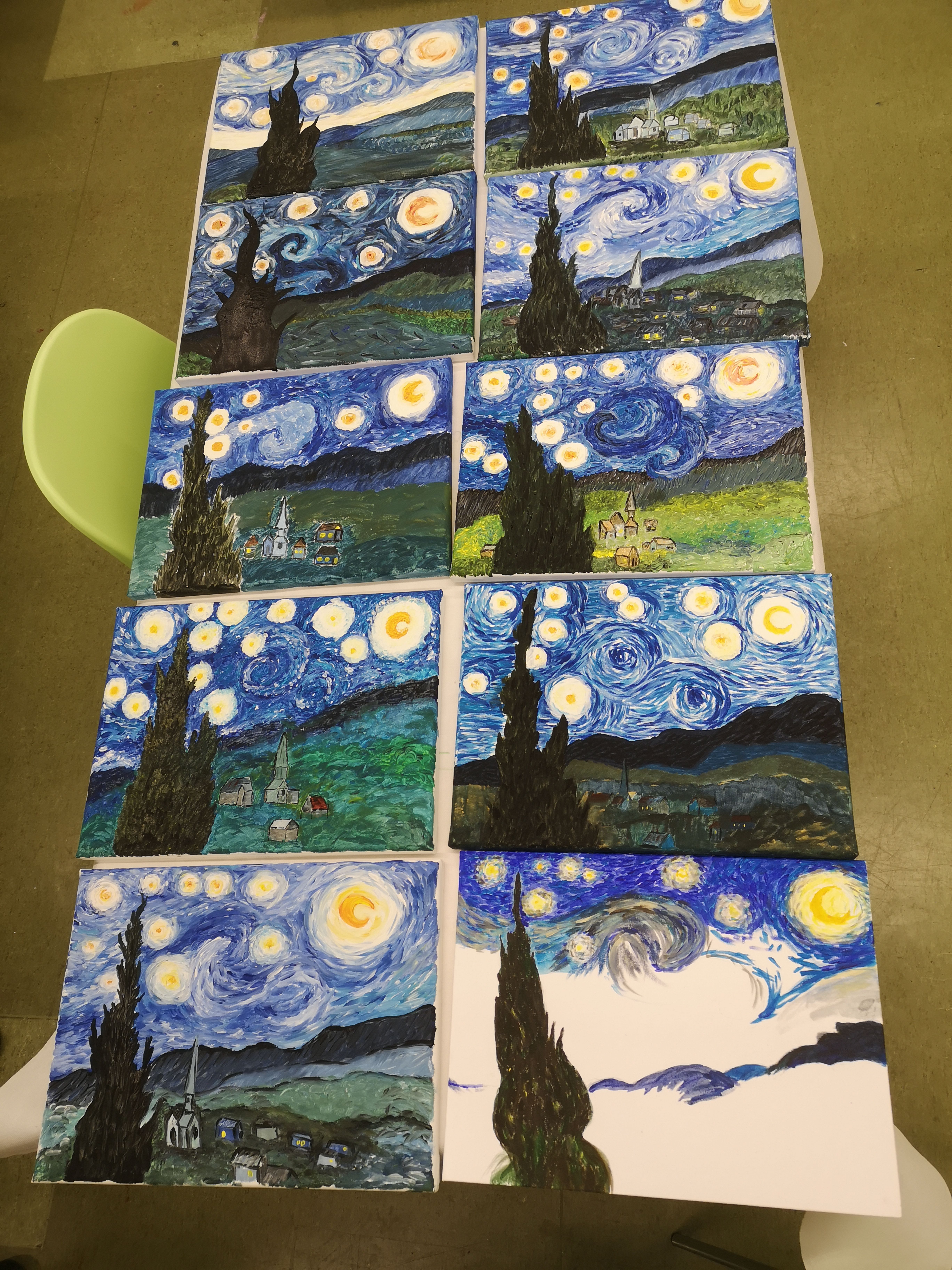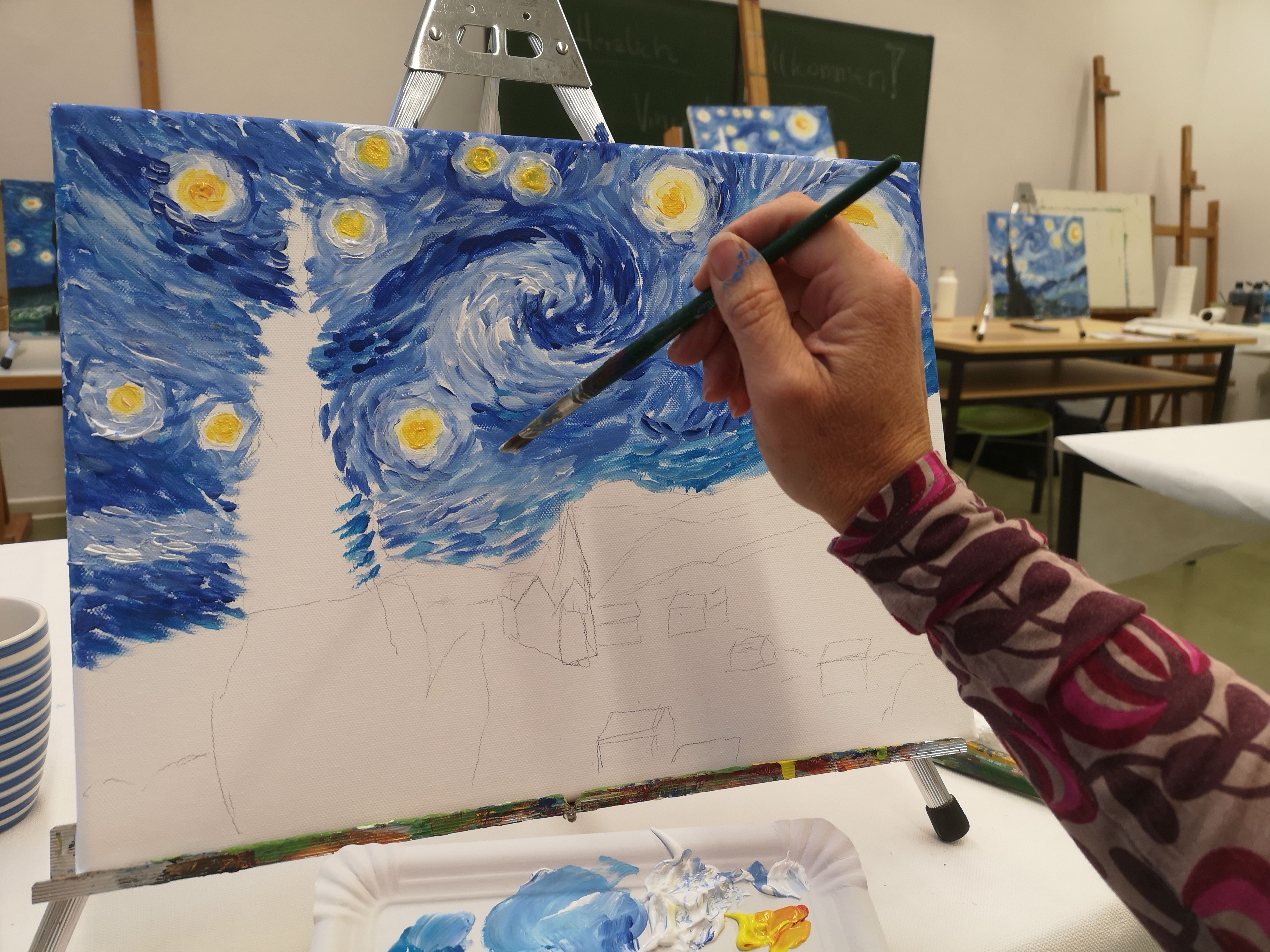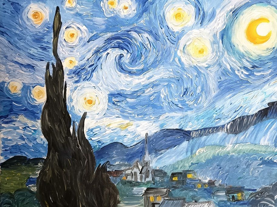 In diesem Workshop beschäftigen Sie sich unter fachkundiger Anleitung mit einem seiner beliebtesten Bilder - der Sternennacht. Mit Pinseln, Acrylfarben und Leinwand lassen Sie leuchtende Sterne, bewegte Himmel und eine friedliche nächtliche Landschaft entstehen. In dieser kulturellen Bildungsveranstaltung erlernen Sie die Grundlage der Acrylmalerei wie Farben mischen und Komposition und setzen diese direkt am eigenen Bild um.