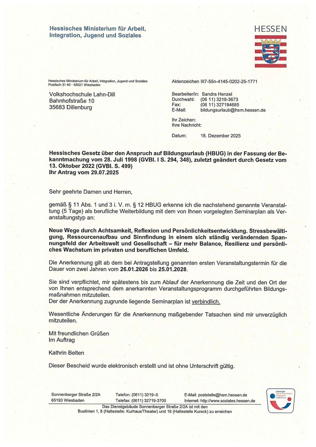 Die Akkreditierung als Bildungsurlaub nach HBUG liegt vor. Ebenso wurde der Bildungsurlaub nach dem Arbeitnehmerweiterbildungsgesetz (AWbG) auch für Arbeitnehmer/innen aus Nordrhein-Westfalen und nach dem Bildungszeitgesetz Baden-Württemberg (BzG BW) genehmigt.