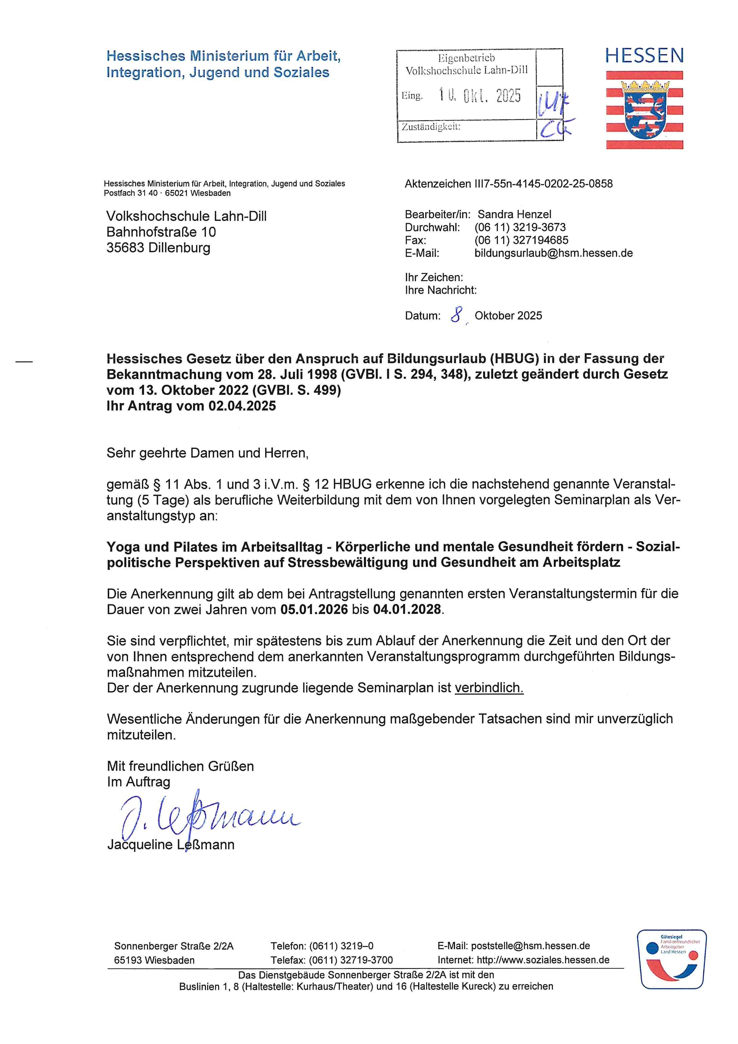 Entdecken Sie, wie Yoga und Pilates zur Förderung Ihrer körperlichen und mentalen Gesundheit im Arbeitsalltag beitragen können. Unser Bildungsurlaub bietet Ihnen die Möglichkeit, effektive Techniken zur Stressbewältigung zu erlernen und neue Energie zu tanken. Erfahren Sie, wie Sie durch gezielte Übungen, Meditation und Atemtechniken Ihre berufliche Leistungsfähigkeit steigern und Ihre Gesundheit nachhaltig fördern können. Das Seminar vermittelt Ihnen praxisnahe Strategien, um sowohl die körperliche als auch die mentale Balance im beruflichen Umfeld zu stärken. Wir beleuchten dabei auch die sozialpolitischen Aspekte der Stressbewältigung und Gesundheitsförderung am Arbeitsplatz und zeigen Ihnen, wie Sie die Prinzipien von Yoga und Pilates in Ihren Arbeitsalltag integrieren und Achtsamkeit und Bewegung zu mehr Wohlbefinden und Leistungsfähigkeit im Beruf führen können.
